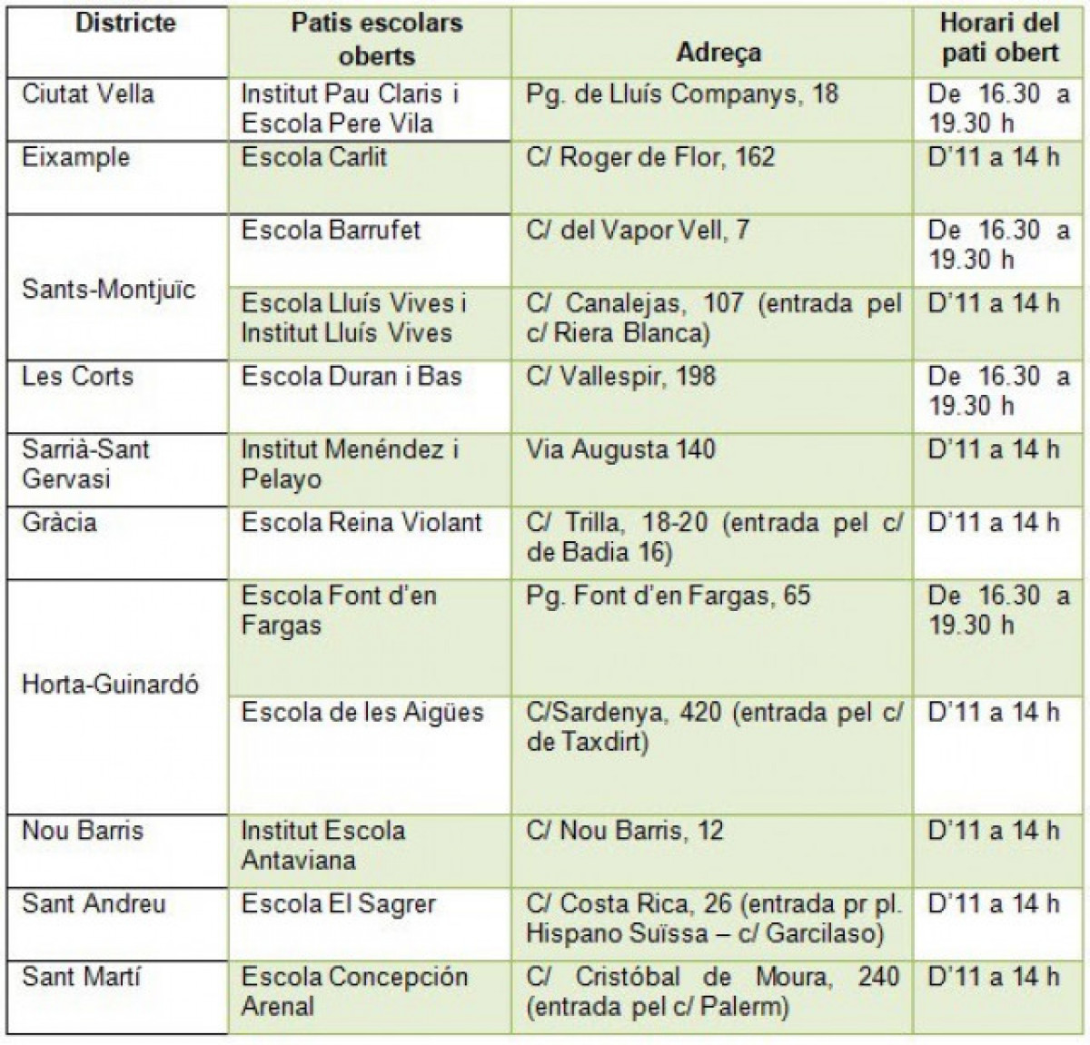 En un comunicat d'aquest dissabte, l' Ajuntament de Barcelona ha detallat que, dels 12 centres, set obriran durant el matí , de les 11.00 a les 14.00 hores, i cinc més a les tardes , de 16.30 a 19.30 hores.
