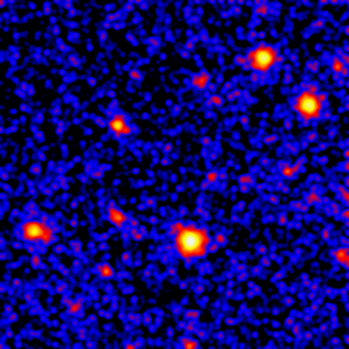Exposició d'un any del LAT de Fermi d'una regió de 20 graus d'ample en la constel·lació de Virgo. Els colors més brillants indiquen fonts de raigs gamma més brillants. ( NASA/DOE/Fermi LAT Collaboration)