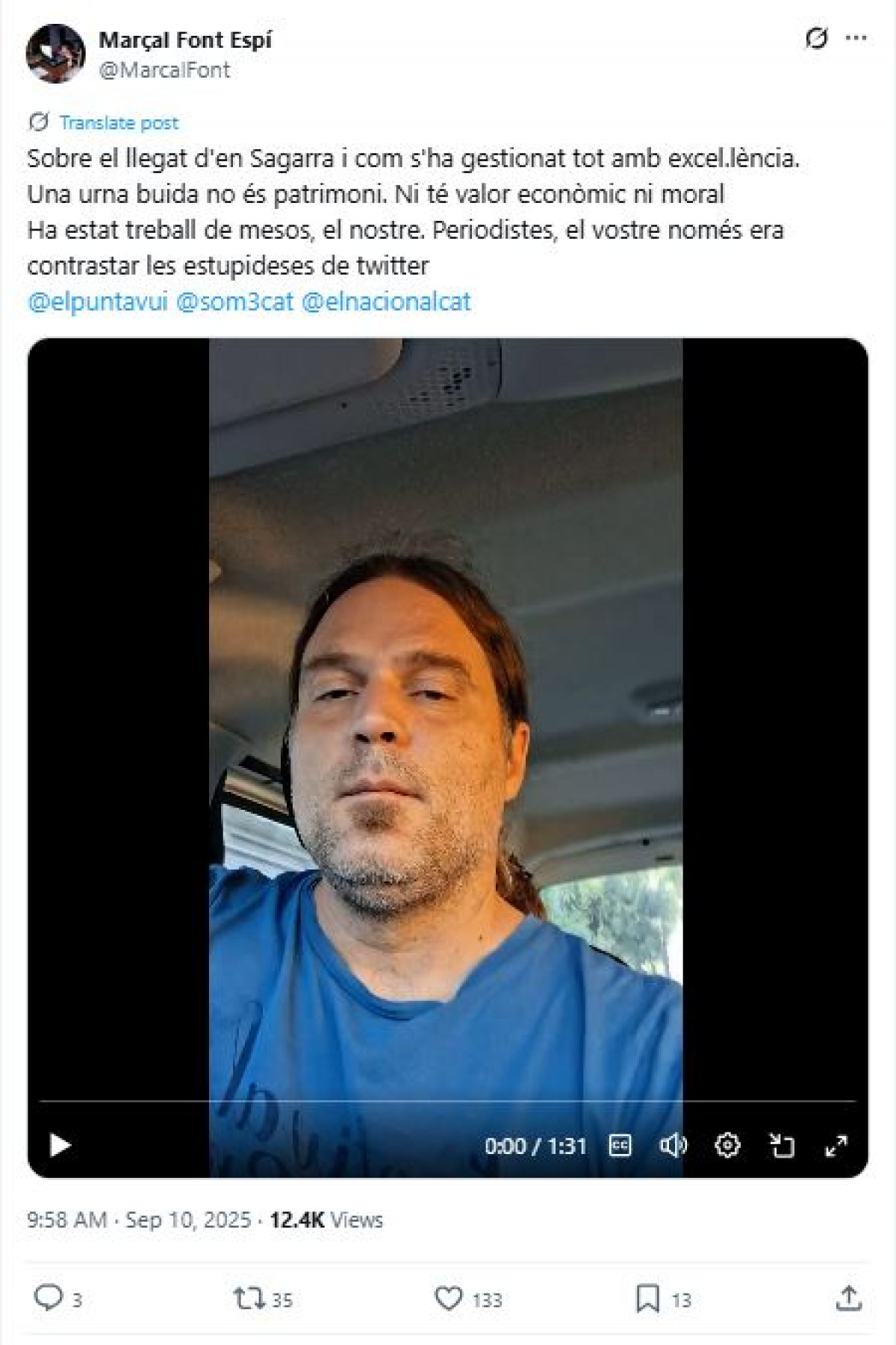 Aquest dijous, Marçal Font ha compartit un missatge a X en què exposa la seva visió sobre la gestió del llegat de Josep Maria de Sagarra. En el text, assegura que molts no comprenen la importància real de les accions que s’han dut a terme: “Una urna buida no és patrimoni. Ni té valor econòmic ni moral”.
