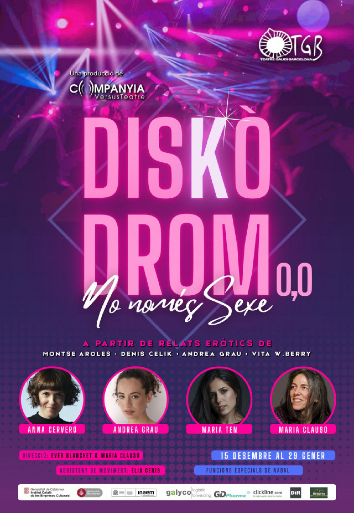 “Diskòdrom 0'0. No només sexe” és una funció estructurada al voltant de quatre monòlegs de les autories esmentades que interpreten respectivament Anna Cerveró, Andrea Grau, Maria Ten i Maria Clausó.