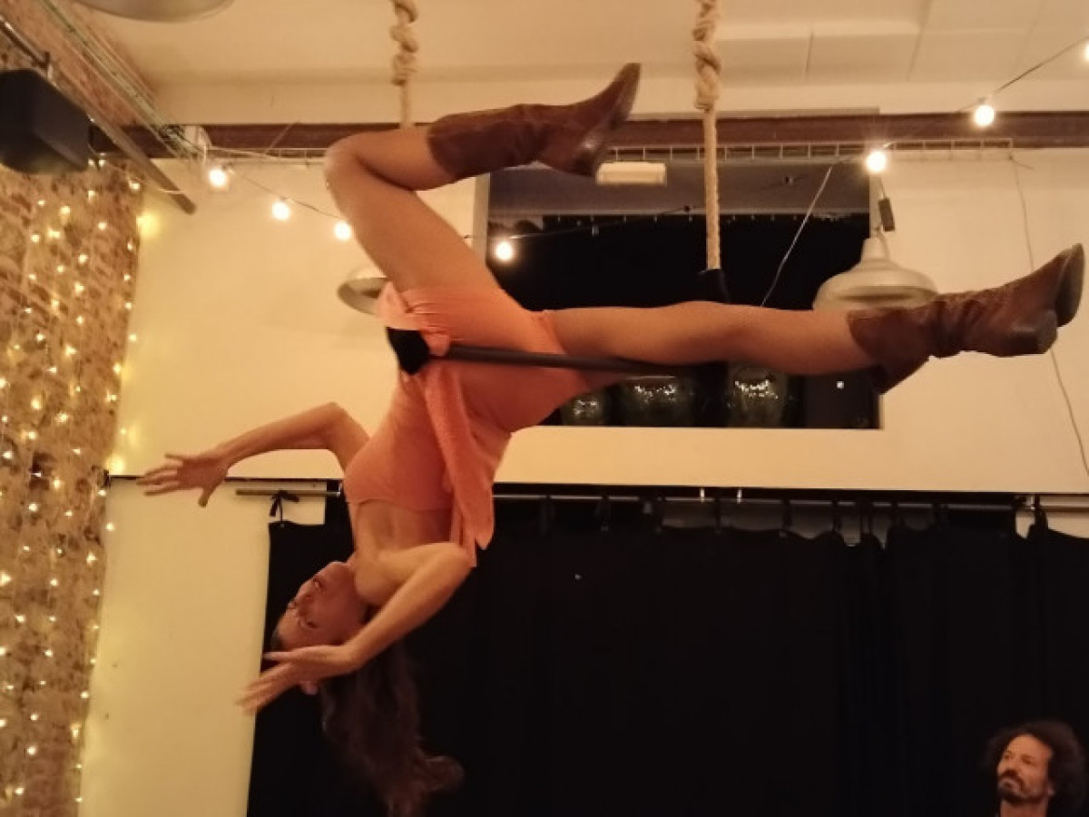 Per aviat cal dir que tot s'inicia al mateix vestíbul on s'ha col·locat estratègicament un trapezi que suscita la perplexitat dels espectadors. Ho entenen quan arriba l'hora de començament de la funció i veuen aparèixer Natalie Ravlich que, vestida amb un succint mallot-faldilla, inicia el desenvolupament d'uns arriscats exercicis de funambulisme. Aquesta exhibició convida a pensar que presenciarem un espectacle de caràcter circense, però no n'hi ha. És tan sols l'aperitiu de l'espectacle principal que es desenvolupa tot seguit a la sala teatral pròpiament dita.