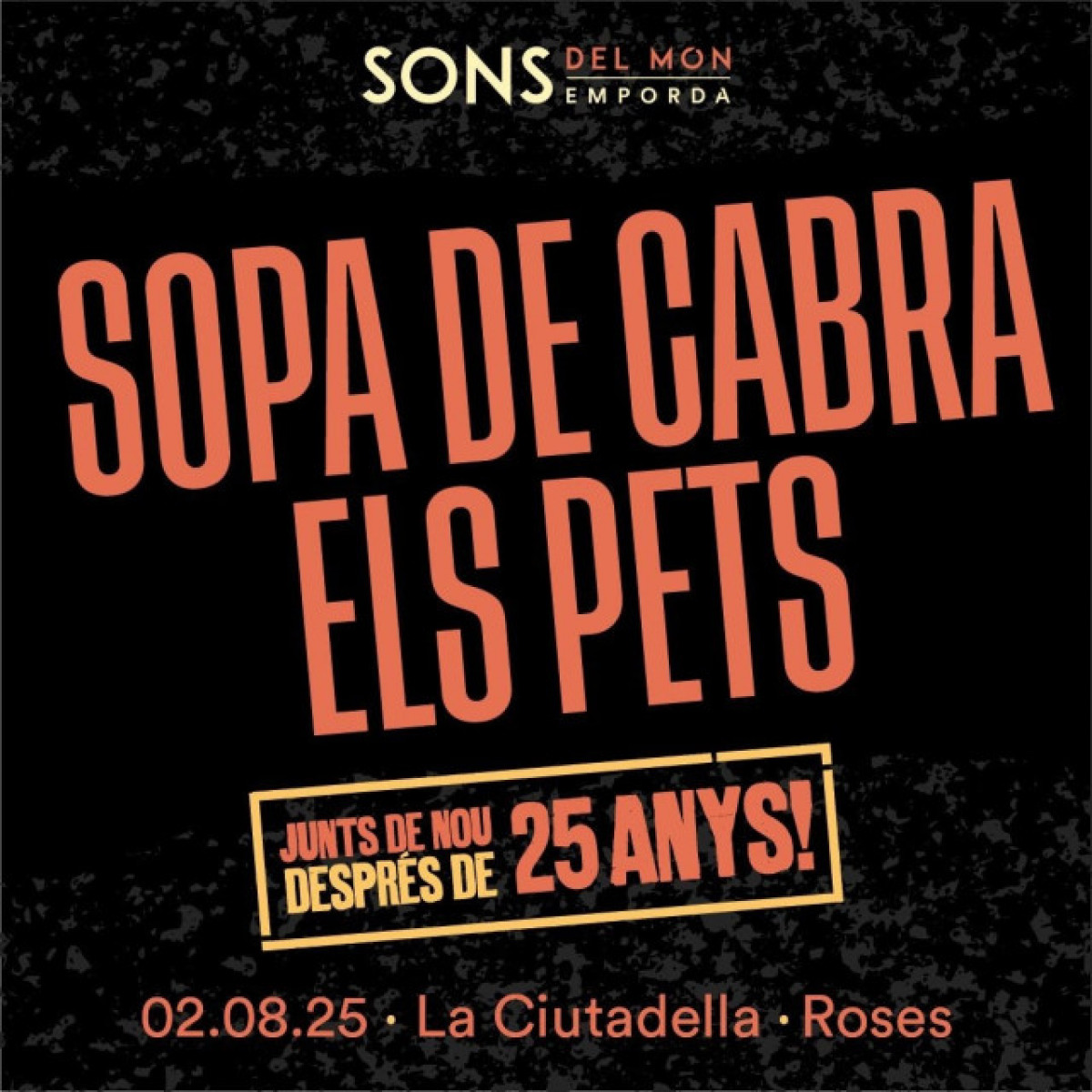 Els grups Sopa de Cabra i Els Pets protagonitzaran la jornada del 2 d'agost del Festival Sons del Món de Roses (Girona) , i tornaran a compartir escenari després de 25 anys, segons ha informat aquest dijous el festival en un comunicat.