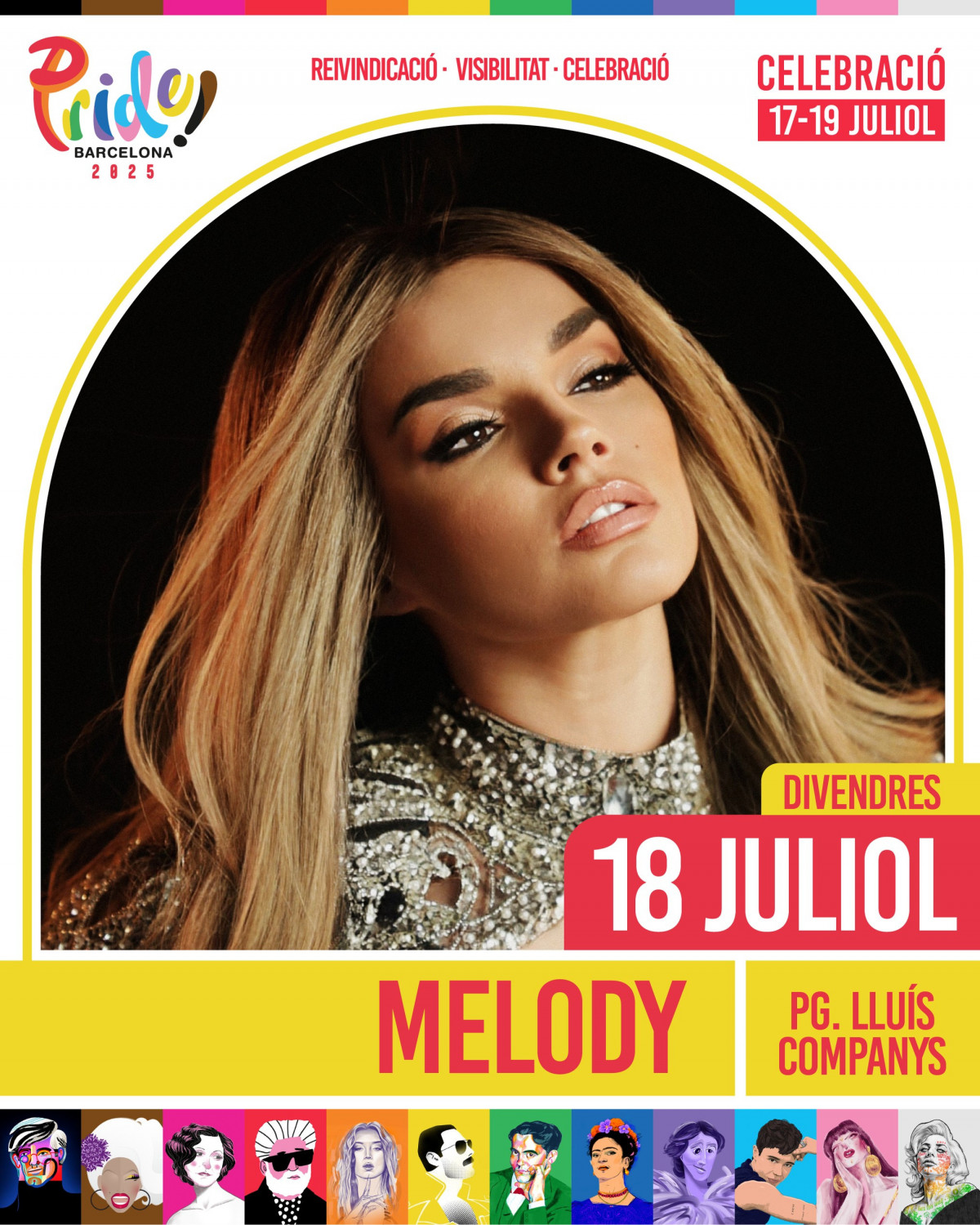 El divendres, 18 de juliol, el Passeig de Lluís Companys vibrarà amb actuacions estel·lars com les de Melody , la irreverent Samantha Hudson, l'explosiu Tommy Cash, i la talentosa Belén Aguilera, a més de clàssics com Sonia i Selena. La nit en aquest escenari estarà presentada per la inconfusible Sharonne, i comptarà amb la participació de K!ngdom, DeTeresa, Carla Frigo i Barcelona Rainbow Singers, al costat de DJs i festes que prolongaran la celebració fins a la matinada. Paral·lelament, la Plaça Universitat oferirà el seu propi desplegament musical amb figures com Jimena Groc, Yenesi, Jota Carajota i el carisma de Victor F. Clares i Rocío Saiz com a presentadors.