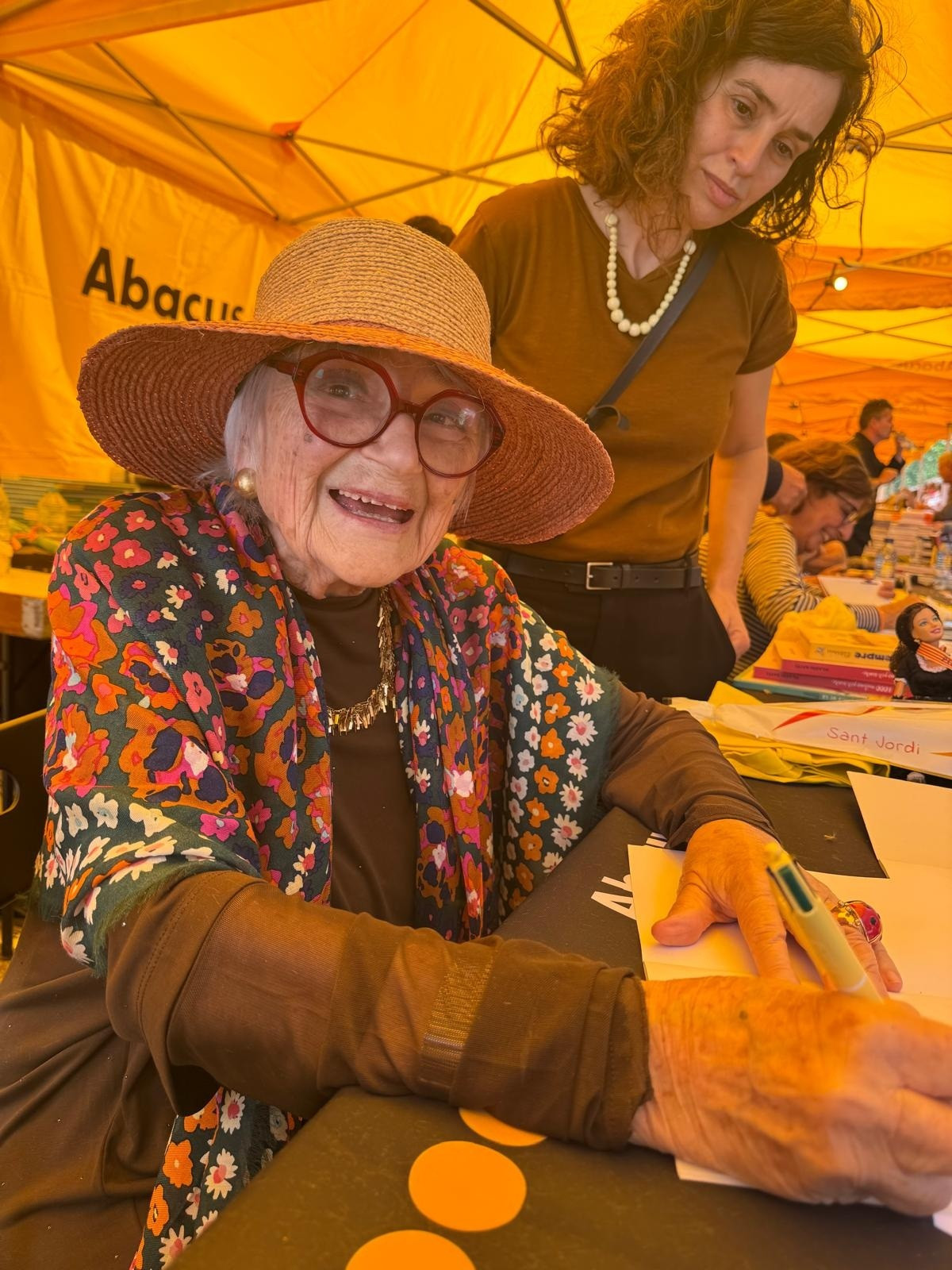 La il·lustradora Pilarín Bayés ha destacat la felicitat que li fa el dia de Sant Jordi i el contacte amb la gent, i, sobre la lectura entre els més petits, ha assegurat: "La lectura per als petits perdurarà".