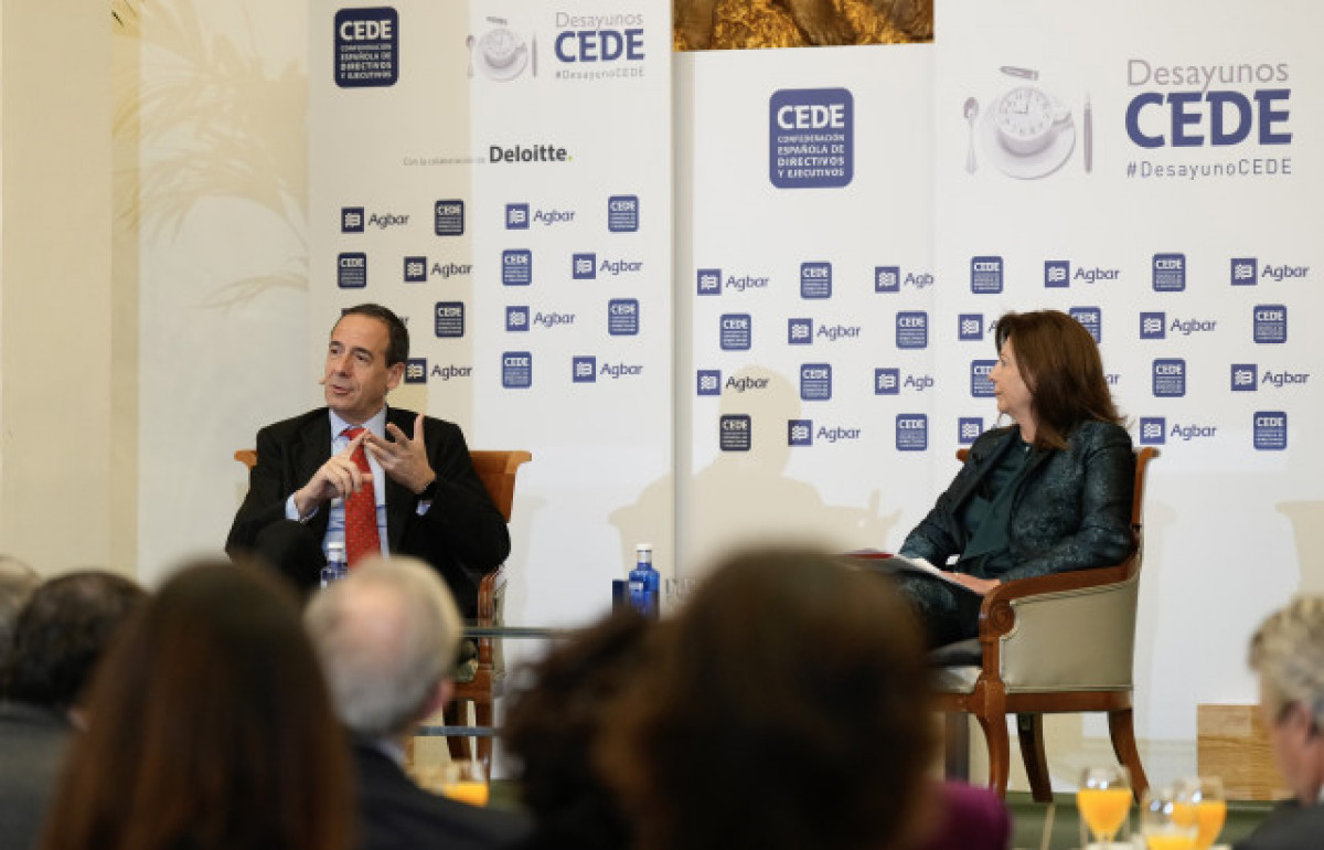 Gonzalo Gortázar , conseller delegat de CaixaBank , ha participat aquest dimecres en un nou Esmorzar de Treball de la Fundació CEDE - Confederació Espanyola de Directius i Executius. L'acte, presentat per César Arranz, president de l'AEEF i vicepresident de la Fundació CEDE, i moderat per Ángeles Delgado, presidenta de Fujitsu ha tingut el patrocini d'Agbar i la col·laboració de Deloitte.