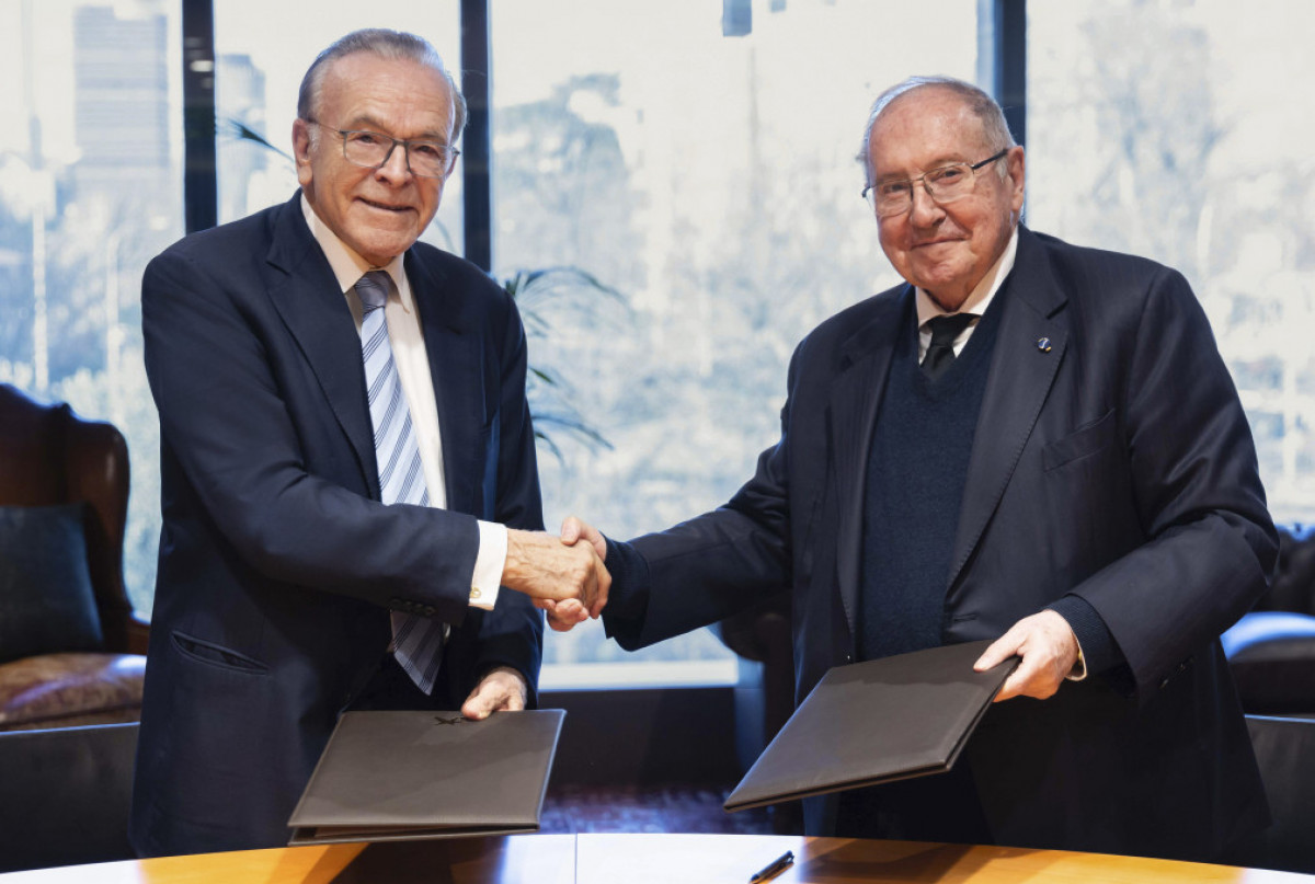 El president de CriteriaCaixa, Isidre Fainé, i el president de la Cambra de Comerç d'Espanya, José Luis Bonet, han signat un acord de col·laboració entre totes dues entitats per al desenvolupament i la implementació del Pla 100 Empreses, una iniciativa impulsada per CriteriaCaixa dins del seu Pla Estratègic 2025-2030.