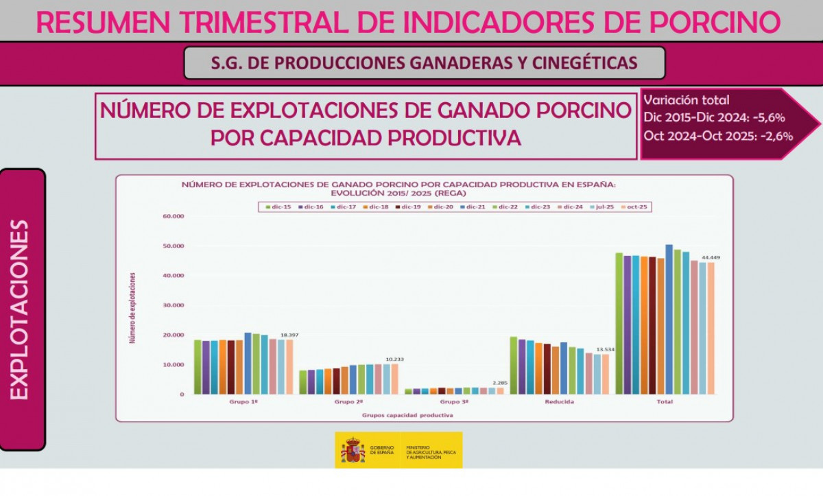 Espanya consolida la seva capacitat productiva, augmentant tant el cens d'animals com el volum de carn, malgrat la reducció del nombre d'explotacions. El cens porcí a Espanya ha aconseguit els 34,6 milions d'animals, la qual cosa suposa un increment del 2,3% respecte a 2023. Fins a setembre de 2025, s'han sacrificat 41,5 milions d'animals. La producció de carn ha crescut un 7,17% en tones i un 5,1% en nombre d'animals. La tendència a la concentració continua. El nombre total d'explotacions se situa en 44.449. Des de 2015 fins a 2024, el nombre de granges ha descendit un 5,6%.