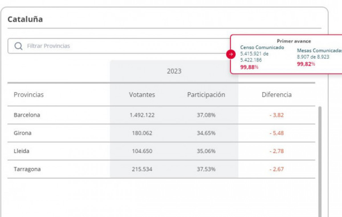 Per províncies, Barcelona registra una participació del 38,88%, 2,02 punts menys, mentres que a Tarragona han votat el 37,24% dels electors, una baixada de 2,96 punts.