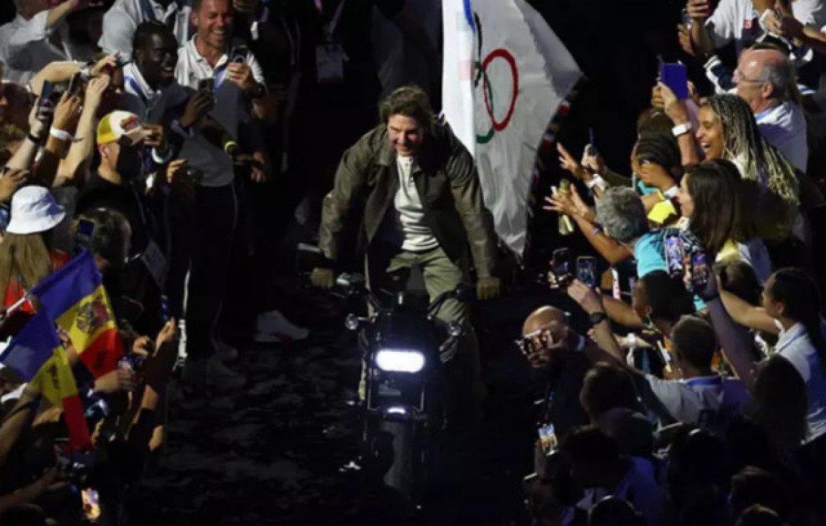 A partir d?aquí, va arrencar la part més cinematogràfica. El popular actor nord-americà Tom Cruise va baixar amb un cable des del més alt de l'estadi fins a l'escenari, va agafar la bandera dels cèrcols olímpics i va sortir amb ella pujat amb moto. Tot això per després saltar des d'un avió a ritme dels Red Hot Chili Peppers i la seva cançó By the way.