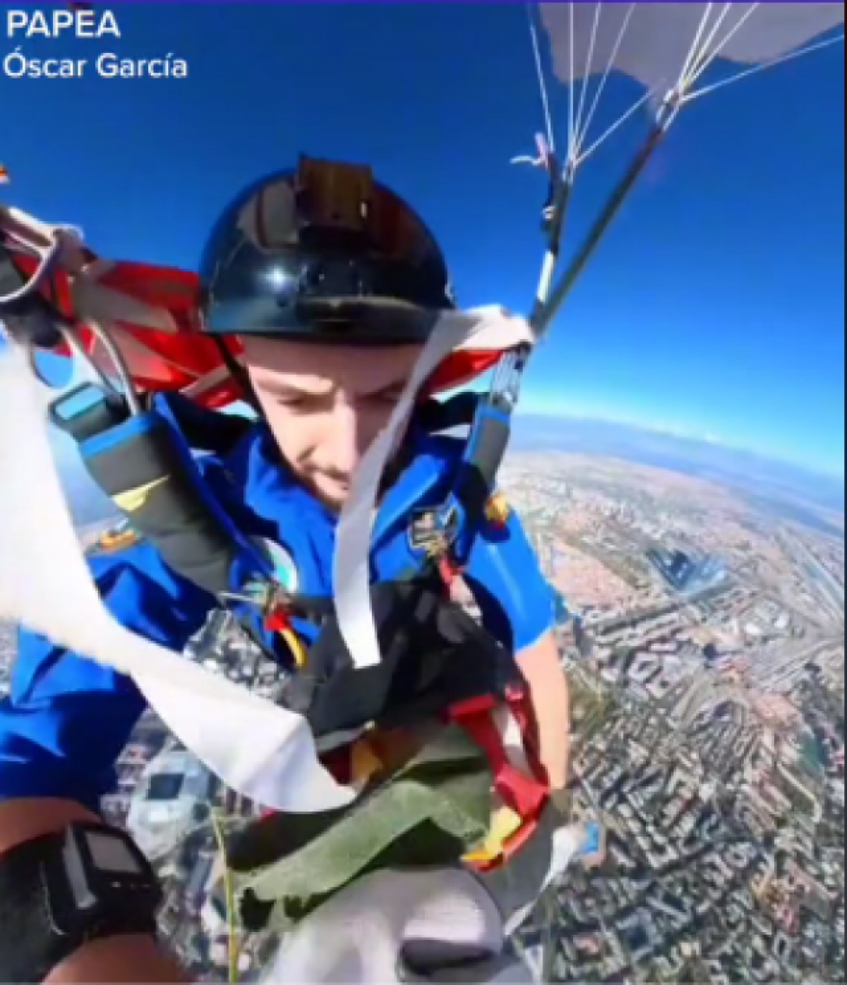 Ara s'ha pogut observar des de la càmera pròpia que portava el paracaigudista com ho va fer per resoldre aquesta incidència tècnica i desenvolupar la bandera per poder aterrar amb èxit.
