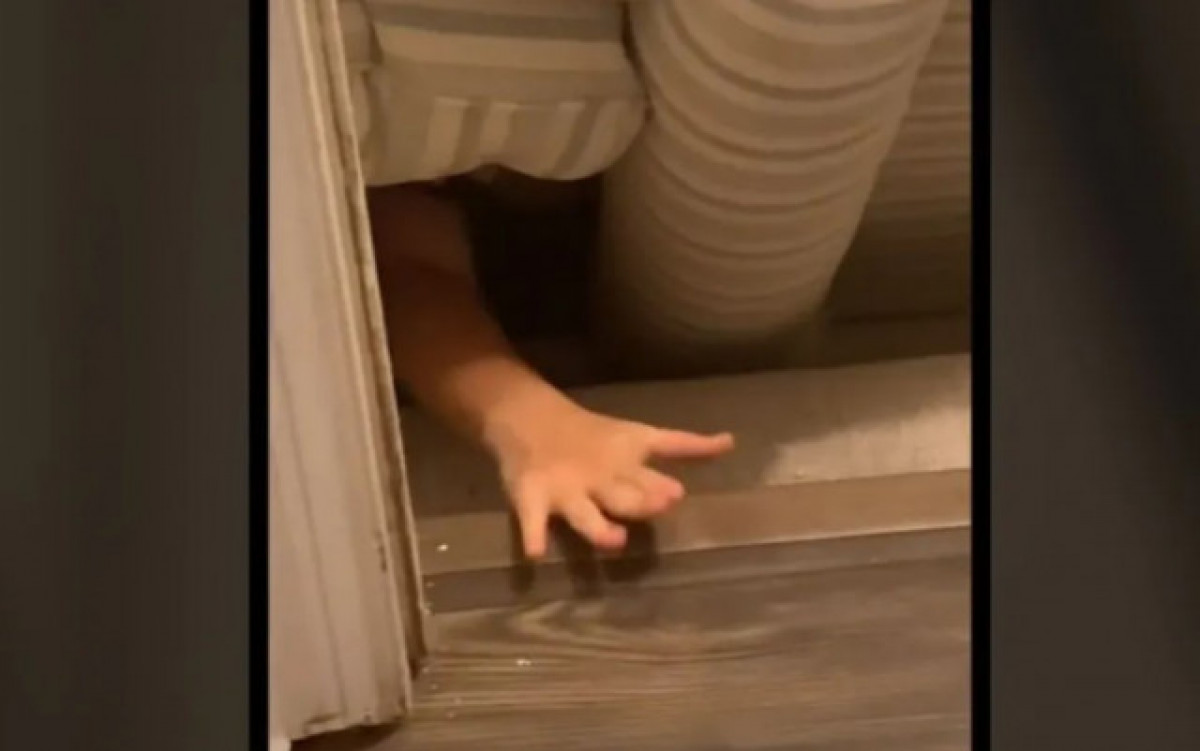 Les imatges hilarants de Claire mostren el sofà que cobreix l'entrada del soterrani i la mà de Melissa sobresortint d'un petit espai entre aquest i l'escala.