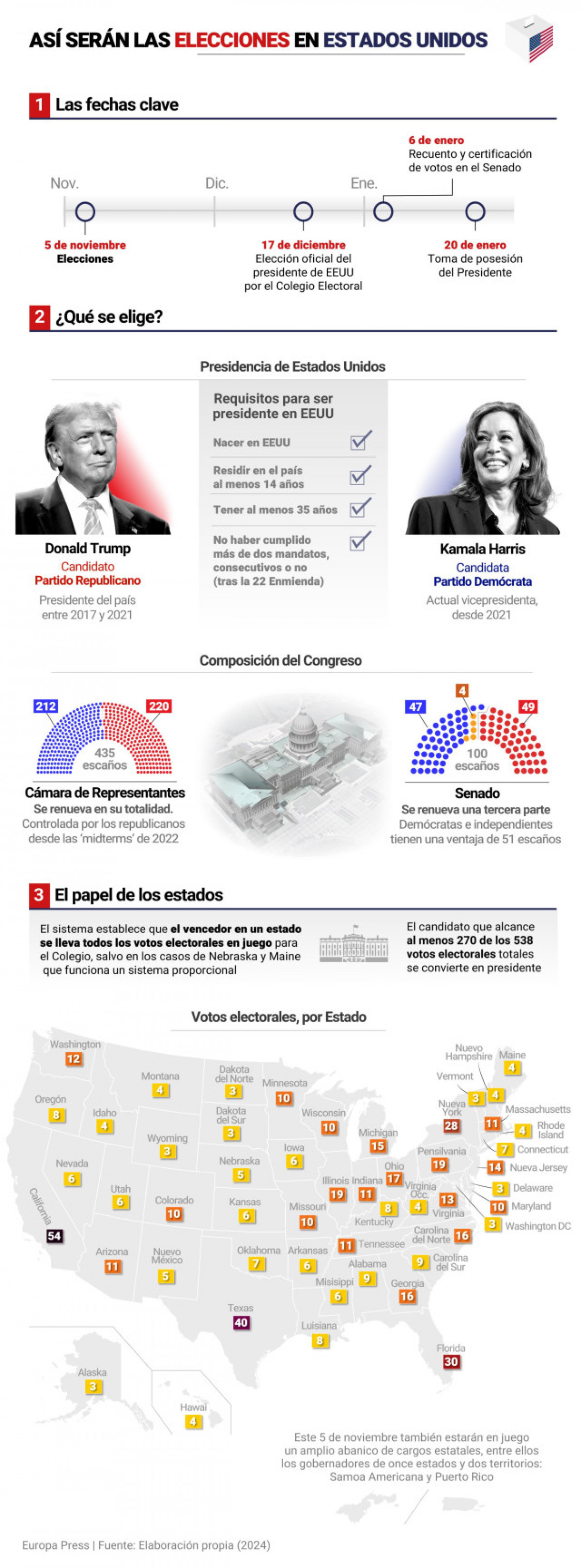 Els nord-americans, quan acudeixin a votar el proper 5 de novembre, estaran triant els 538 compromissaris del Col·legi Electoral, en virtut d'un repartiment que té en compte el cens de cada estat.