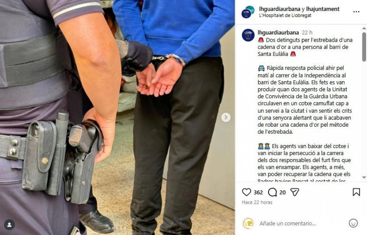 Ahir al matí, els agents de la Unitat de Convivència de la Guàrdia Urbana circulaven en un vehicle camuflat cap a un servei a la ciutat quan van sentir els crits d’una dona alertant que li havien arrabassat una cadena d’or mitjançant el mètode de l’estrebada. Segons fonts policials, «els agents van baixar del cotxe i van iniciar la persecució a peu dels dos responsables fins que els van enxampar».