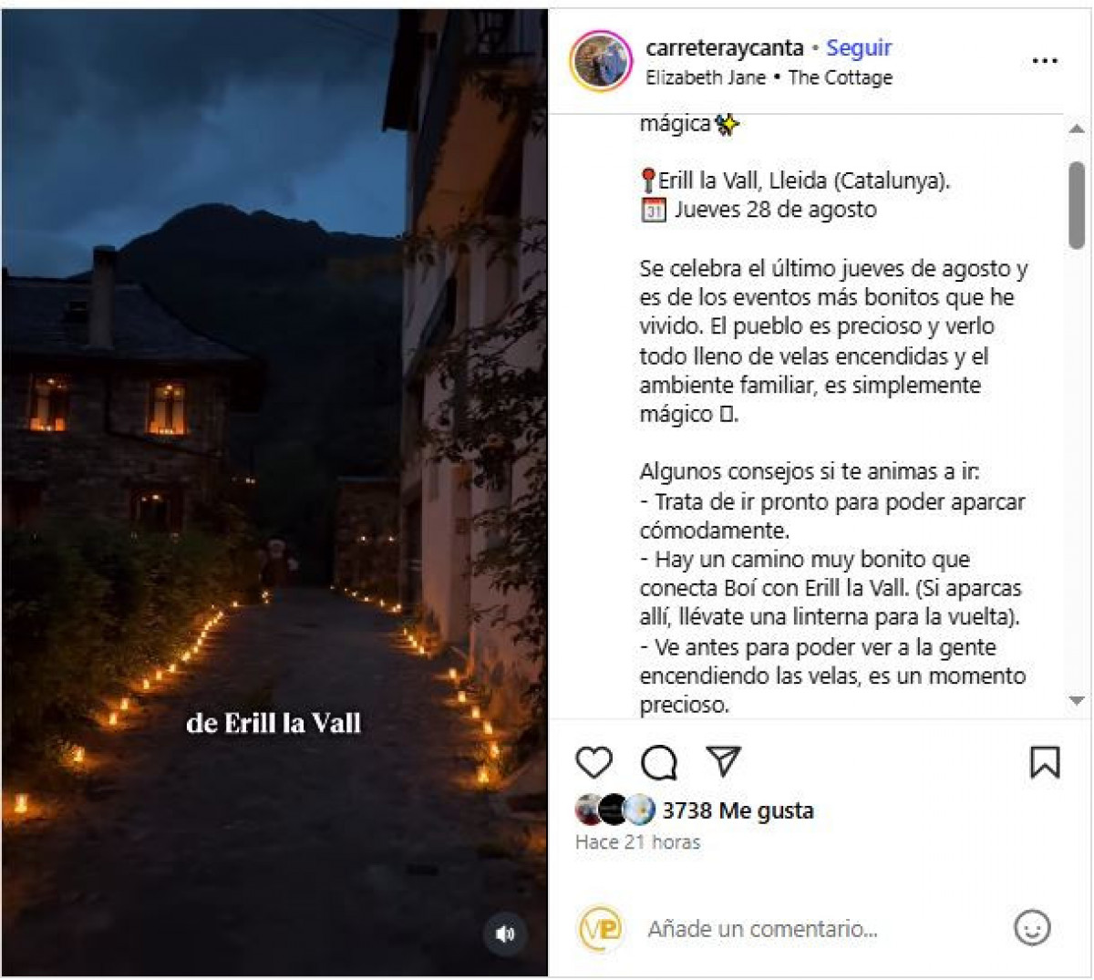 El compte d’Instagram @carreteraycanta ha compartit un vídeo on mostra un camí il·luminat amb espelmes i una casa rural decorada, anunciant l’esdeveniment que cada últim dijous d’agost transforma Erill la Vall en un escenari màgic.
