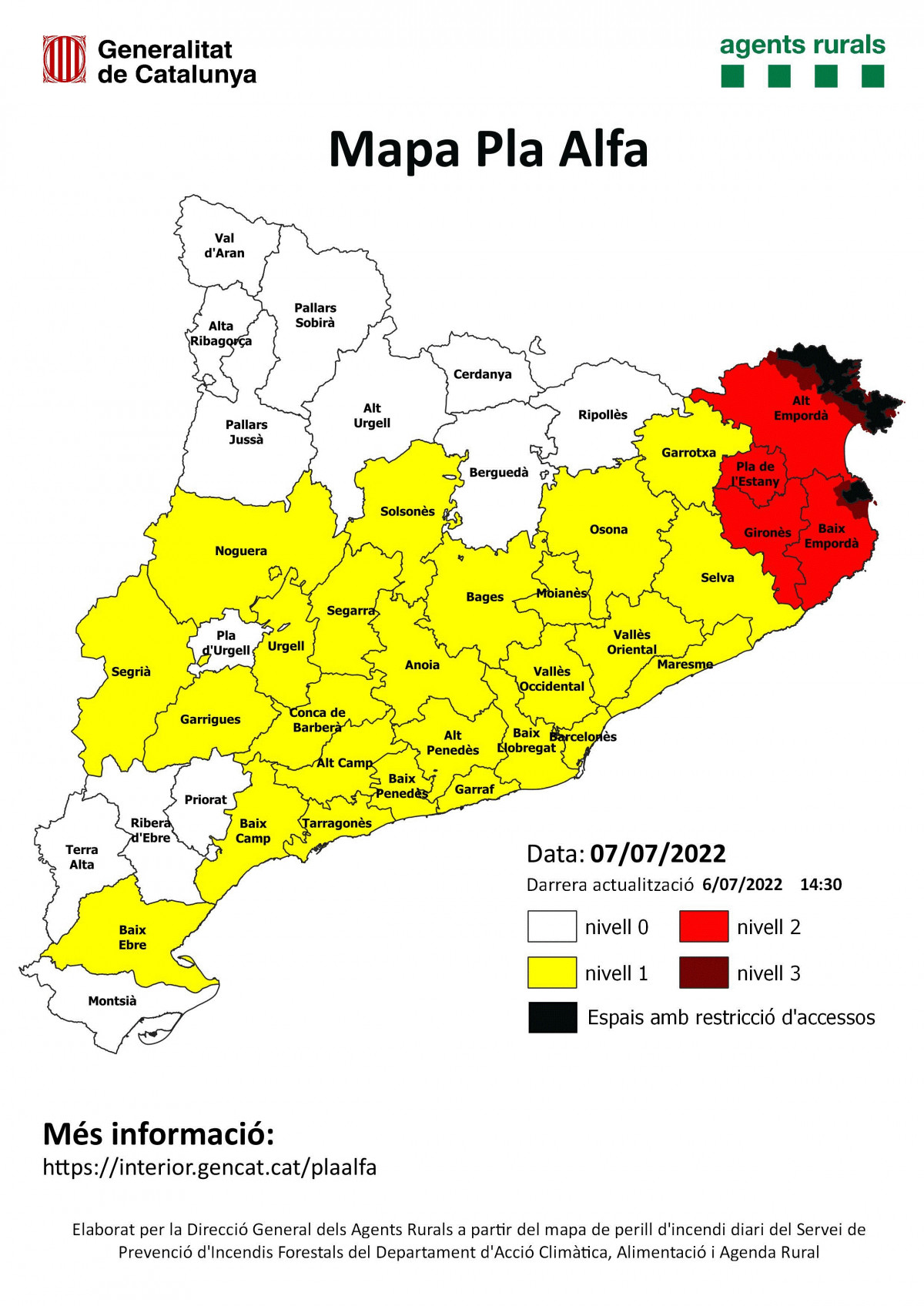 El Govern ha activat, la mitjanit del 7 de juliol, el nivell 3 del Pla Alfa (el màxim del pla operatiu) a 20 municipis de l'Empordà per "perill extrem d'incendi". La intenció és que la situació s'allargui fins aquest diumenge 10 de juliol.