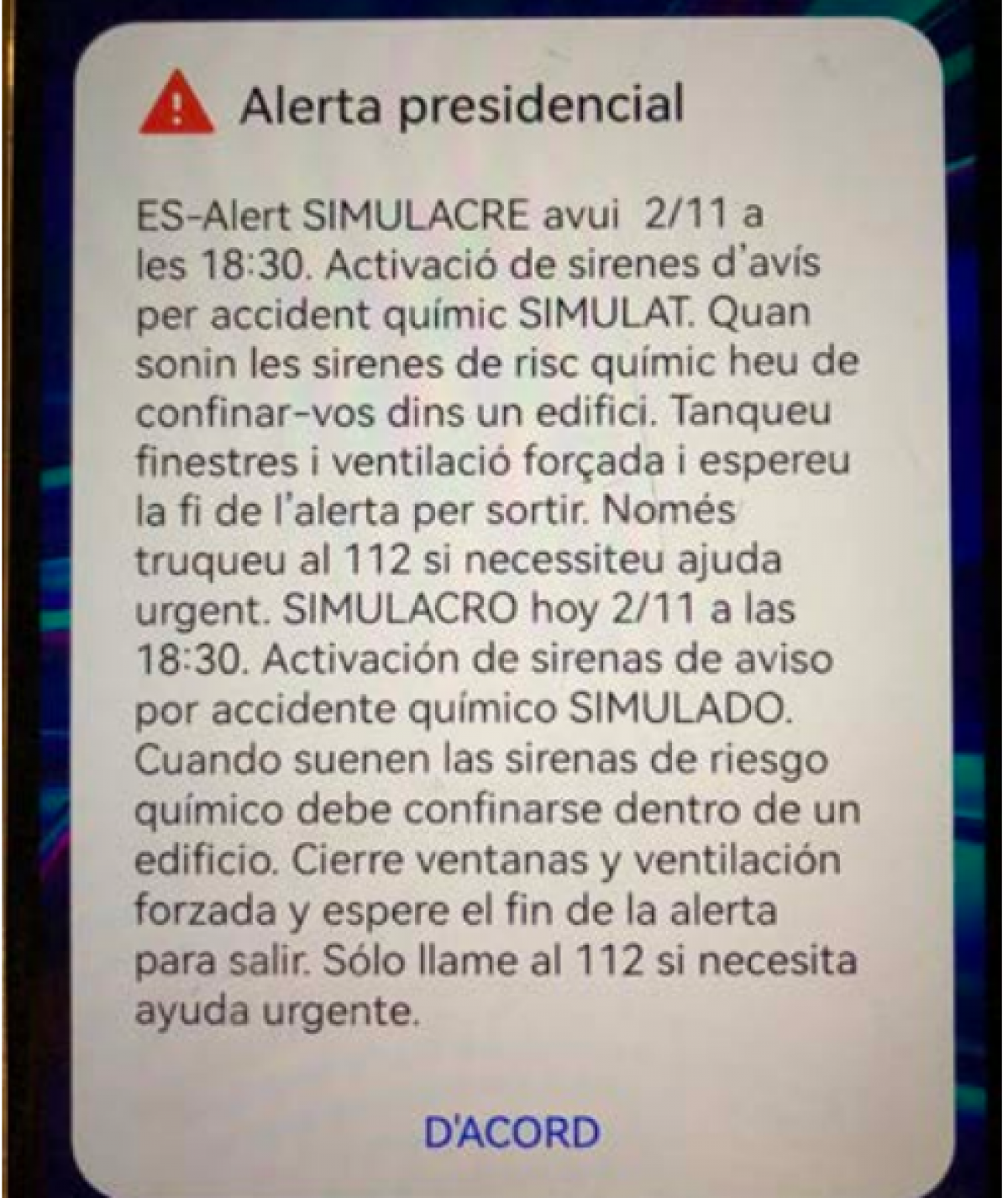 Aquestes mesures simulen el que caldria fer en cas d'un incident químic real. Després de finalitzar la prova, s'enviarà una segona alerta als mòbils per a comunicar la desactivació del confinament.