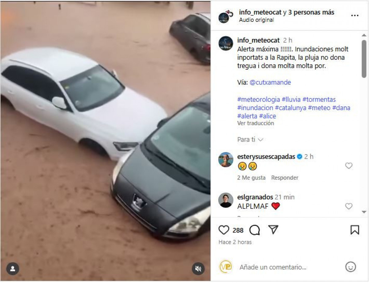 En xarxes socials, la magnitud de la situació s'ha viralitzat gràcies a un vídeo publicat per l'usuari d'Instagram @info_meteocat, que ha descrit la situació amb un missatge contundent: “Alerta màxima!!!!!! Inundacions molt importants en La Ràpita, la pluja no dóna treva i dóna molta, molta per”. Les imatges mostren una avinguda convertida en un torrent d'aigua, amb vehicles surant i un cabal desbordat que supera l'altura de les voreres.