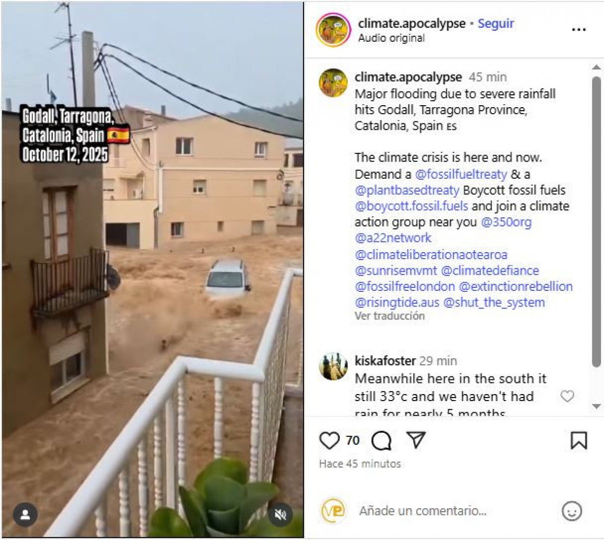 El vídeo difós per @climate.apocalypse ha generat una onada de comentaris d'usuaris de diferents països, molts dels quals expressen la seva sorpresa per la força del temporal i la seva solidaritat amb els afectats.
