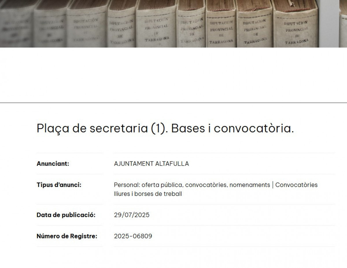 La inestabilitat en l'administració local catalana s'agreuja a causa de la falta de personal amb oposicions per a cobrir llocs clau i la mobilitat forçada dels interins. El cas de l'Ajuntament d'Altafulla és un clar exemple. Han llançat tres convocatòries per a la plaça de secretari municipal en menys de sis mesos.Les dues primeres han quedat desertes.Esperen que la tercera sigui la definitiva, almenys per als pròxims tres anys.
