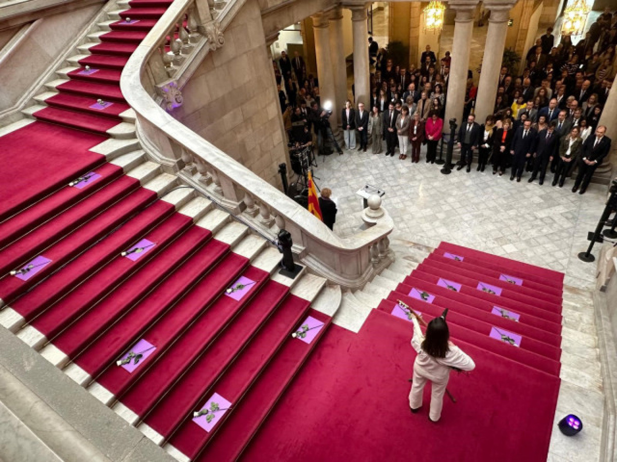 Després de llegir la declaració, el president de la Generalitat, Salvador Illa, el president del Parlament, Josep Rull, la resta de membres del Govern i els diputats dels signants del text s'han dirigit cap a l'escala d'honor de l'hemicicle, on han guardat un minut de silenci en record de les víctimes de feminicidi aquest any.