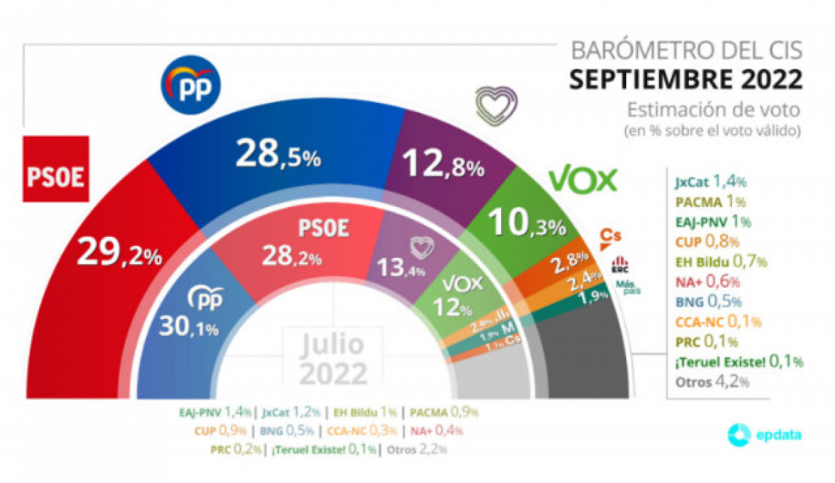 El baròmetre del Centre d'Investigacions Sociològiques (CIS) corresponent al mes de setembre situa el PSOE com el partit amb més estimació de vot, amb un 29,2% , arrabassant al PP la primera plaça que havia conquerit per primera vegada a la legislatura passat mes de juliol. En concret, atorga als d'Alberto Núñez Feijóo un 28,5% . La distància entre tots dos és de 7 dècimes el que, a la pràctica suposa un empat tècnic.