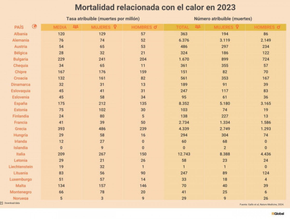 Els resultats identifiquen els països del sud d'Europa com els "més afectats", atès que presenten les majors taxes de mortalitat relacionada amb la calor: Grècia (393 morts per milió d'habitants), Bulgària (229), Itàlia (209), Espanya (175), Xipre (167) i Portugal (136).