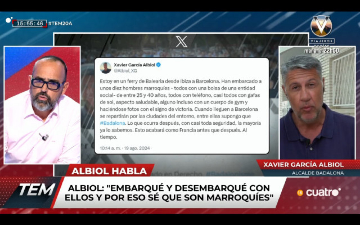 L'alcalde de Badalona, Xavier García Albiol, ha entrat en directe al programa 'Todo es Mentira' per donar explicacions sobre el seu polèmic tuit publicat a la xarxa social X - abans coneguda com a Twitter-.