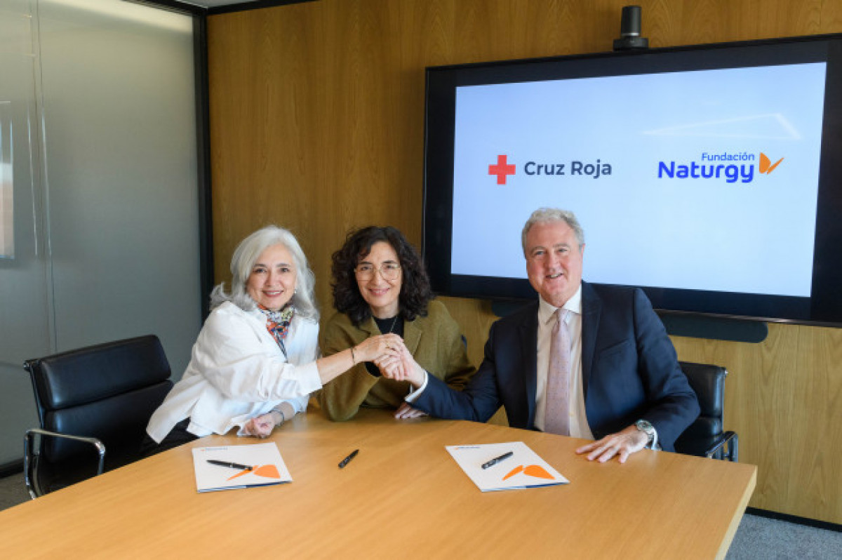 El vicepresident de Fundació Naturgy, Jordi Garcia Tabernero , la directora general de la fundació, María Eugenia Coronado, i la presidenta de la Creu Roja Espanyola, María del Mar Pageo Giménez , van signar la renovació del conveni pel qual la fundació de la companyia energètica es compromet a mantenir la seva aportació de recursos per fer aquest acompanyament global en matèria d'energia.