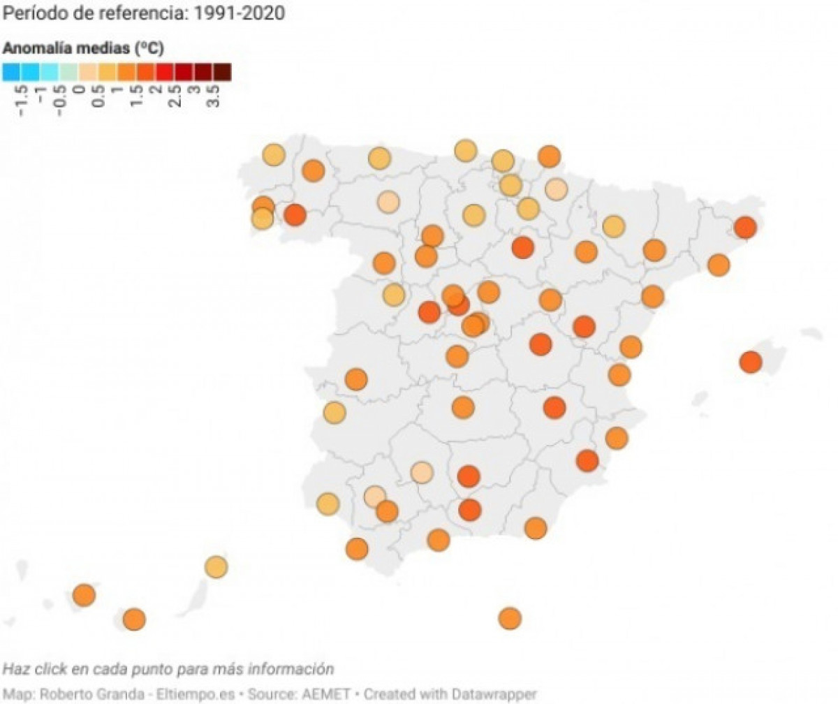 Per contra, les anomalies menys destacades es van donar en algunes ciutats del nord del país, així com en punts de la Vall del Guadalquivir. Sevilla, per exemple, va presentar una temperatura mitjana de 19,6ºC, per la qual cosa va estar exactament en el valor climàtic del 1991 al 2020.