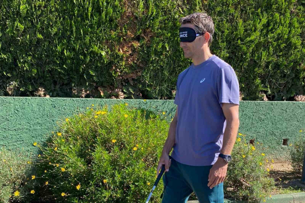 El tenista Tommy Robredo es posa en la pell d’una persona cega per un dia i juga a tenis amb un antifaç