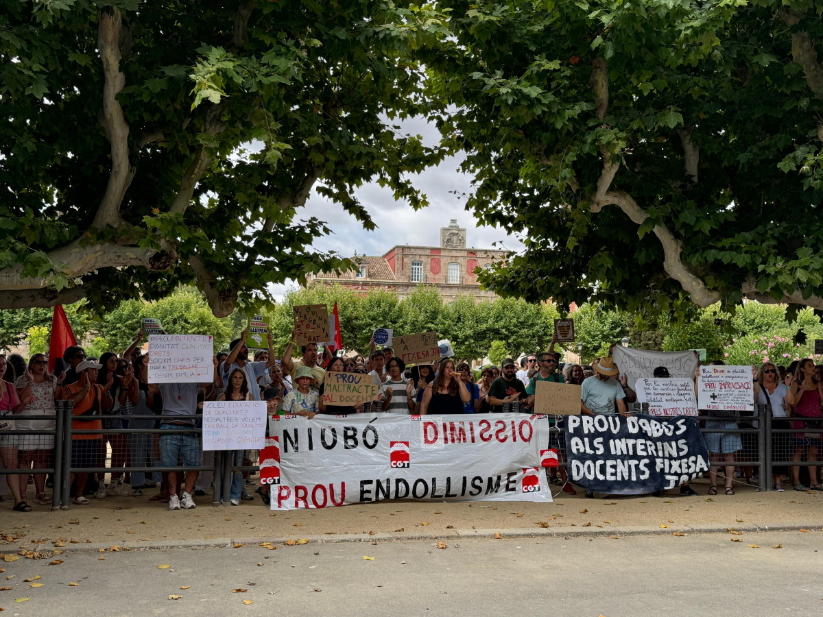 La protesta, convocada per Ustec·Stes, CGT i Intersindical, ha coincidit amb la compareixença de Niubó a les 12 h en la Comissió d'Educació i FP, on ha donat explicacions sobre l'error massiu en l'adjudicació de vacants docents que ha generat una forta indignació en el sector. Entre crits de “Niubó dimissió” i pancartes com “N'hi ha prou de maltractament, lluitem”, “No ho feu pitjor perquè no és possible” o “Docents lluitant, estem ensenyant”, els manifestants han denunciat la inseguretat i el caos que ha generat el procés.