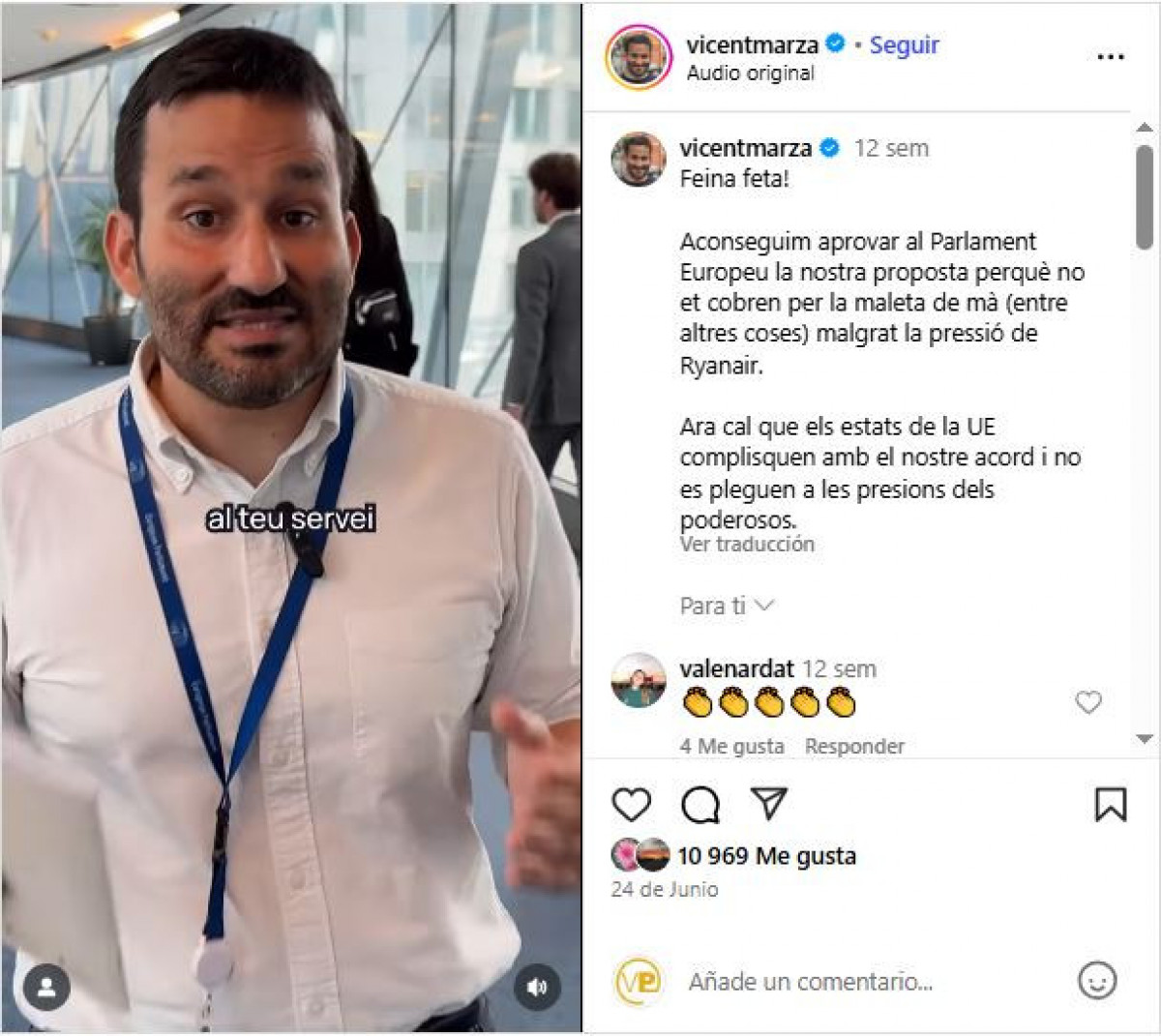 Vicent Marzà, portaveu de Compromís a la Comunitat Valenciana, va anunciar en el seu compte d'Instagram @vicentmarza que el Parlament Europeu ha aprovat la seva proposta de no cobrar per la maleta de mà i de protegir els drets de passatgers, malgrat la pressió de Ryanair.