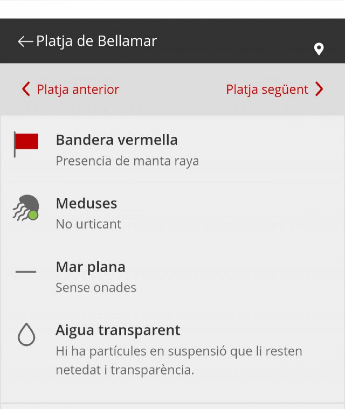 La presència d'una manta ratlla a prop de la costa ha obligat aquest dissabte a penjar la bandera vermella a la platja de Bellamar de Premià de Mar (Barcelona), cosa que prohibeix banyar-se al mar.