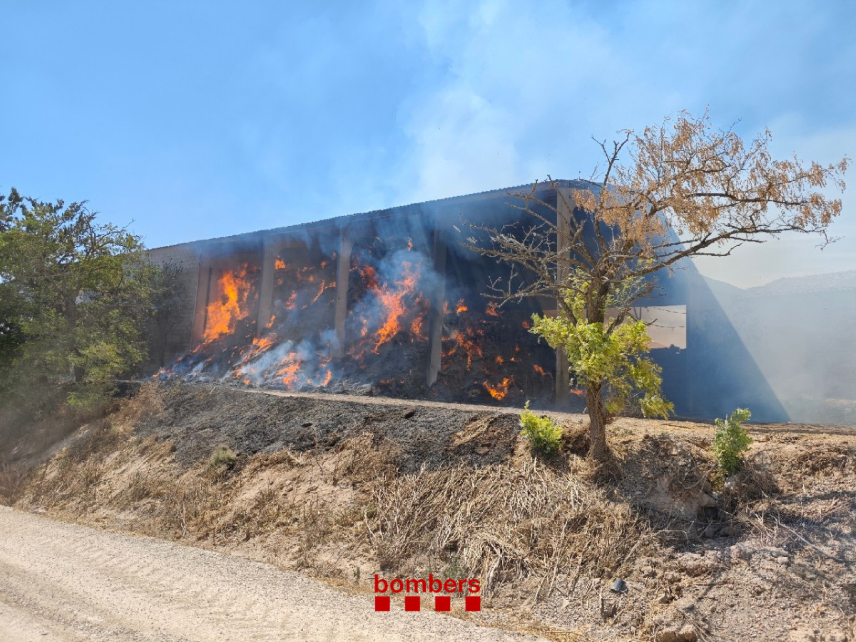 Els Bombers de la Generalitat han envoltat amb línia d'aigua un paller en flames en una finca d'Oliola per a evitar la propagació a camps i a la granja veïna