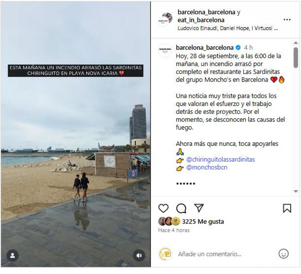 La primera confirmació pública del sinistre no va arribar pels canals oficials, sinó a través de les xarxes socials. El compte d’Instagram @barcelona_barcelona va publicar un vídeo en què s’observaven les restes del local, reduït a cendres i amb l’incendi ja extingit. El missatge que acompanyava la gravació relatava: “Avui, 28 de setembre, a les 6:00 del matí, un incendi va arrasar completament el restaurant Las Sardinitas del grup Moncho’s a Barcelona”.