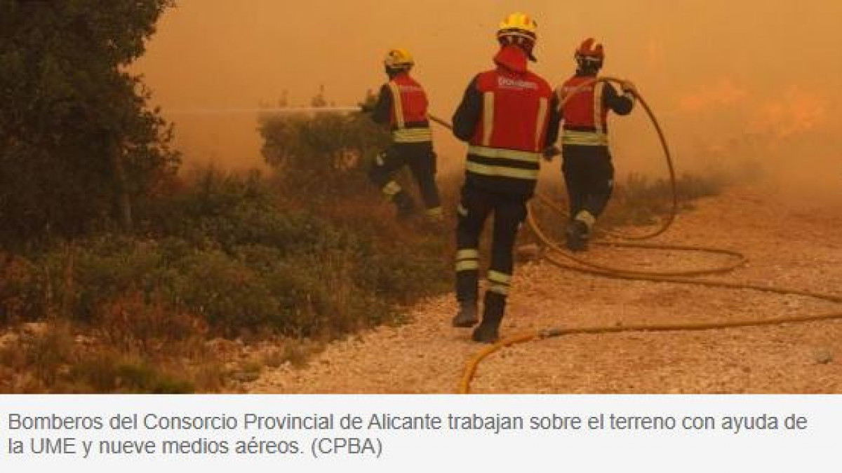 Els bombers del Consorci Provincial d'Alacant, juntament amb la UME i un total de nou mitjans aeris, continuen desplegats sobre el terreny per a intentar frenar l'avanç de les flames i protegir un dels entorns naturals més valuosos de l'interior alacantí.