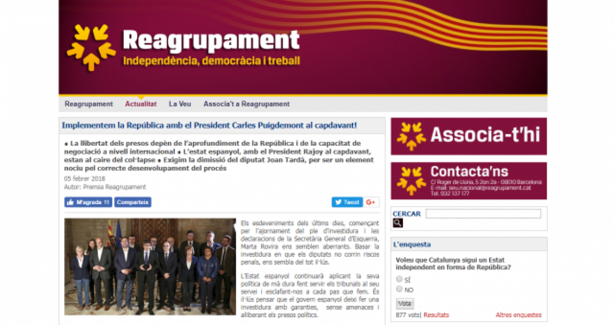 Reagrupament defensa investir president a Carles Puigdemont sense més dilacions i avisa que és el moment de materialitzar la independència sense por, concloent: "Els presos polítics no sortiran de la presó fins que implementem la República, mai abans".