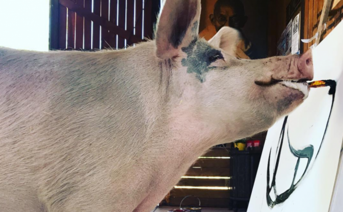 Pigcasso, el porc pintor, és en realitat una truja rescatada d'un escorxador de Ciutat del Cap, Sud-àfrica.