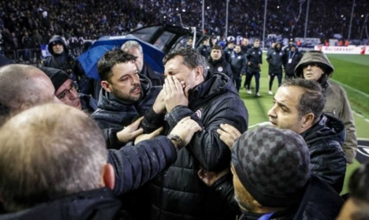 A pocs segons de començar l'important duel de la vintè tercera jornada al futbol grec entre el primer i el tercer classificat, la trobada va quedar suspès pel llançament d'un rotllo de paper de caixa registradora que va colpejar a la cara de l'exjugador, segons els mitjans locals.