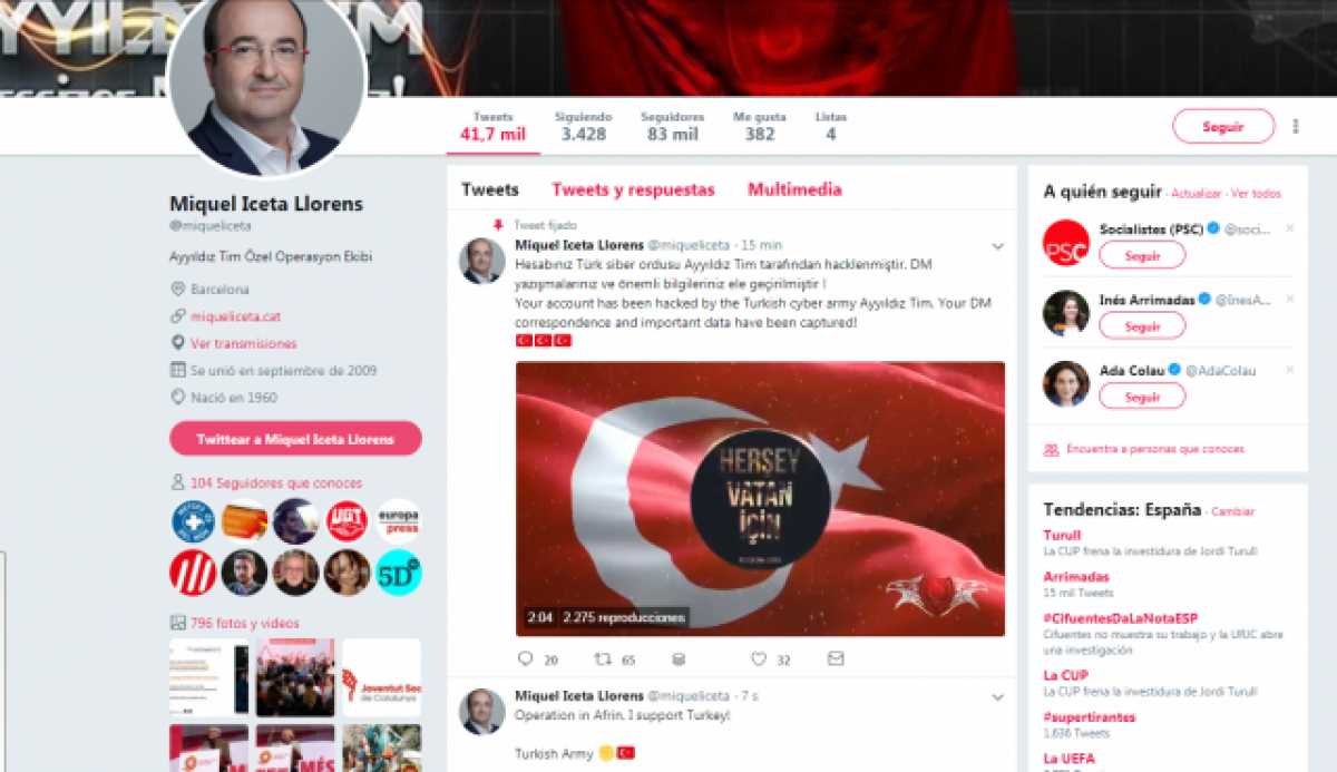 El compte personal a Twitter del secretari general del PSC, Miquel Iceta, ha estat hackejada aquest dijous 22 de març. Ha succeït mentre Iceta ha assistit al Ple d'investidura de Jordi Turull.
