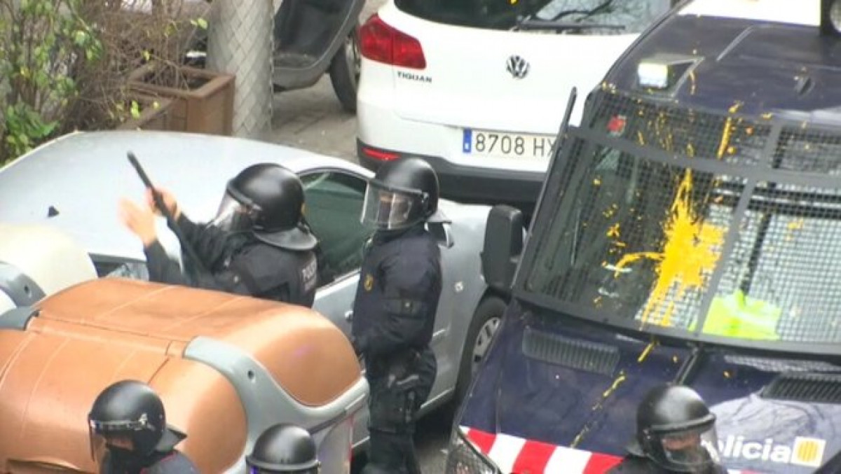 Els manifestants dels Comitès en Defensa de la República (CDR) i agents dels Mossos d'Esquadra han forcejat a la cruïlla dels carrers València i Llúria a Barcelona, on els Mossos han desplegat un cordó per evitar que la mobilització arribi a la Delegació del Govern.