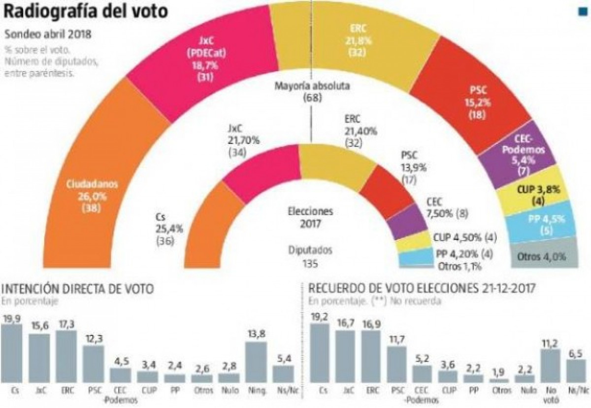Ciutadans tindria dos escons més dels que va obtenir al desembre, per la qual cosa es mantindria com la primera força del Parlament amb 38 escons i el 26% del vot. Aquest augment es deu al fet que els taronges són la primera opció electoral per als catalans d'entre 30 i 64 anys.