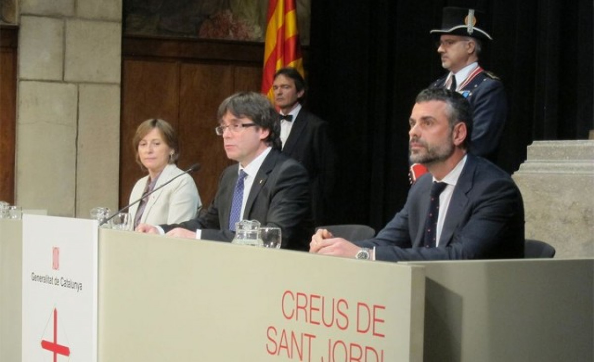 Carme Forcadell, Carles Puigdemont i Santi Vila en l'acte de lliurament de 2016 (Europa Press)