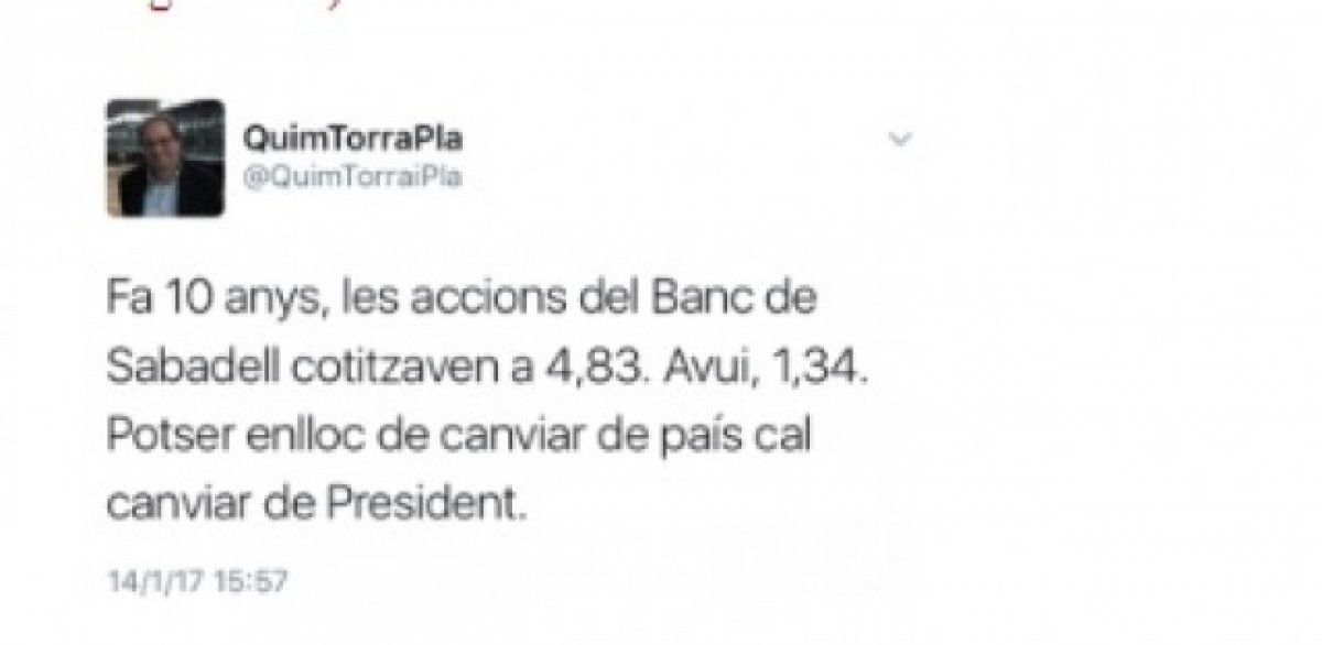 Els tuits del passat segueixen perseguint Quim Torra, el nou President de Catalunya. Aquest cop a sortit a la palestra el tuit en el qual a principis de 2017 demanava canviar al President del Banc de Sabadell, Josep Oliu , per anunciar que en cas de secessió el Sabadell traslladaria la seva seu fora de Barcelona. Una cosa que finalment va ocórrer a l'octubre de 2017 per decisió del consell d'administració de Banc Sabadell en una reunió extraordinària.
