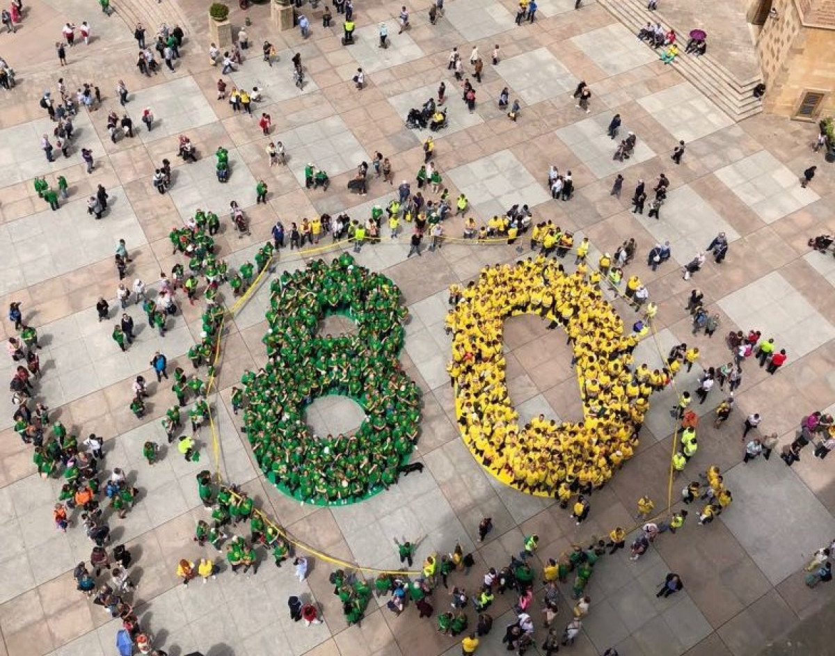 El número 80 format per persones amb els colors de l'entitat (ONCE Catalunya)