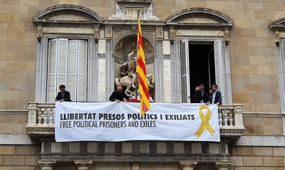 Pancarta i llaç groc al balcó de la Generalitat (Europa Press)