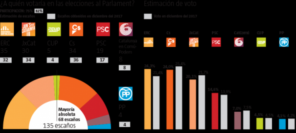 En les eleccions catalanes, la victòria seria d'ERC amb 35 escons i el 24,3% dels vots, superant a Cs, que baixaria als 34 diputats i obtindria el 24% dels vots.