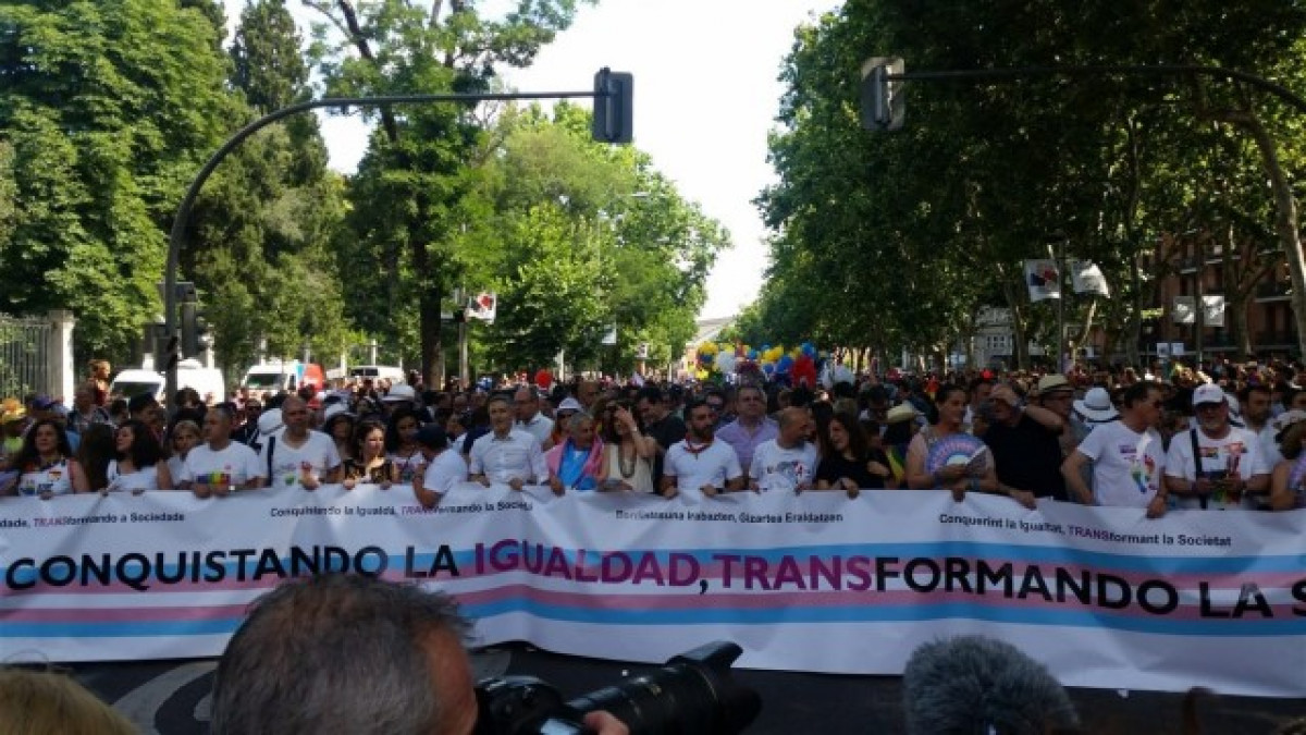 La capçalera, al darrera de la pancarta amb el lema 'Conquerint Igualtat, transformant la societat', en referència a la reivindicació principal d'aquest any: el reconeixement legal al dret a l'autodeterminació de gènere de les persones transsexuals, està sostinguda per representants polítics convidats, entre els quals es troben la ministra de Sanitat, Consum i Benestar Social, Carmen Montón, el ministre d'Interior, Fernando Grande-Marlaska, i la ministra d'Economia i Empresa, Nadia Calviño.