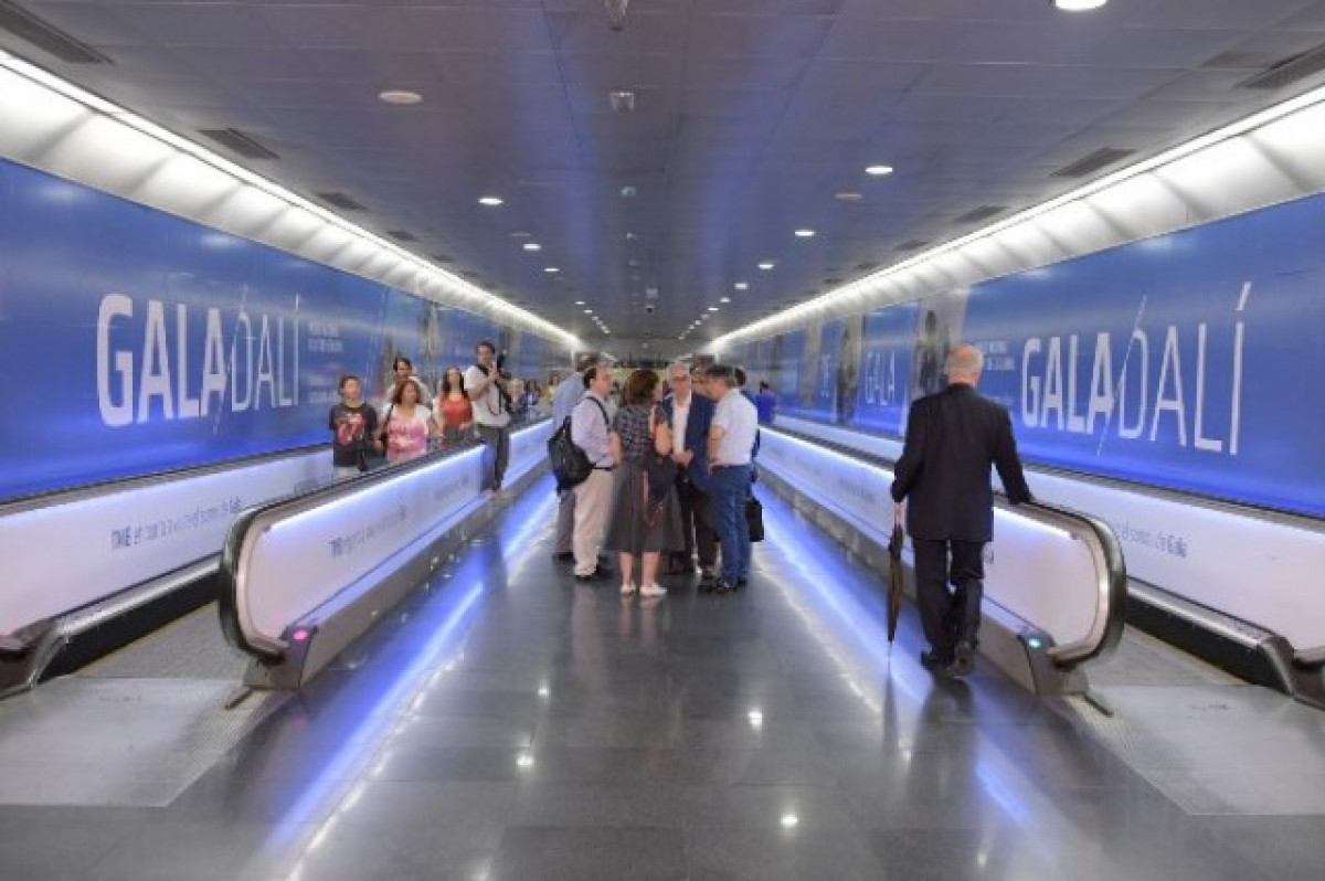 El passadís d'enllaç de l'intercanviador de l'estació de Diagonal, entre les línies 3 i 5 de metro, acull reproduccions en gran format d'algunes de les imatges de l'exposició temporal Gala Salvador Dalí del MNAC.