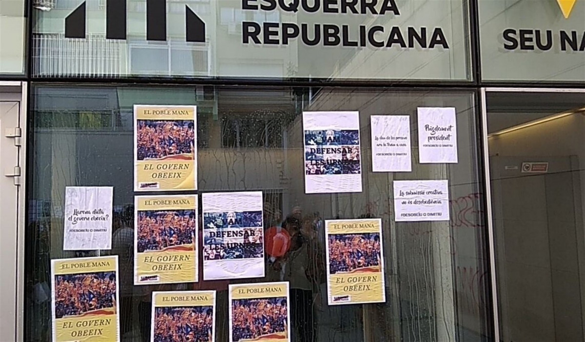 Els manifestants s'han plantat davant la porta principal de la seu i han realitzat una pintada amb el lema 'Desobedeiu o dimitiu', a més de penjar cartells amb el lema 'El poble mana i el Govern obeeix'.